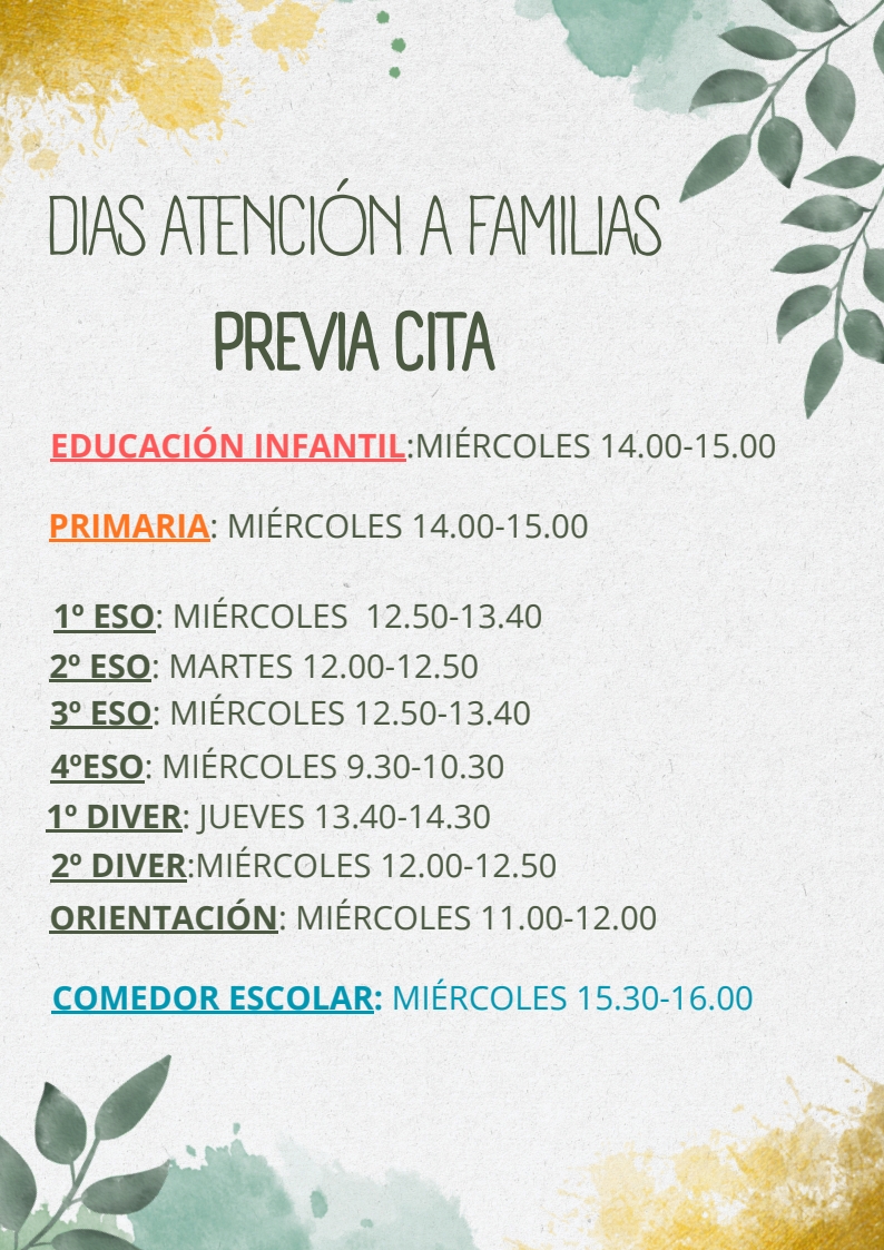 Os dejamos en el siguiente enlace un documento con la información de los días y horarios que se han establecido desde el centro para la atención a las familias.